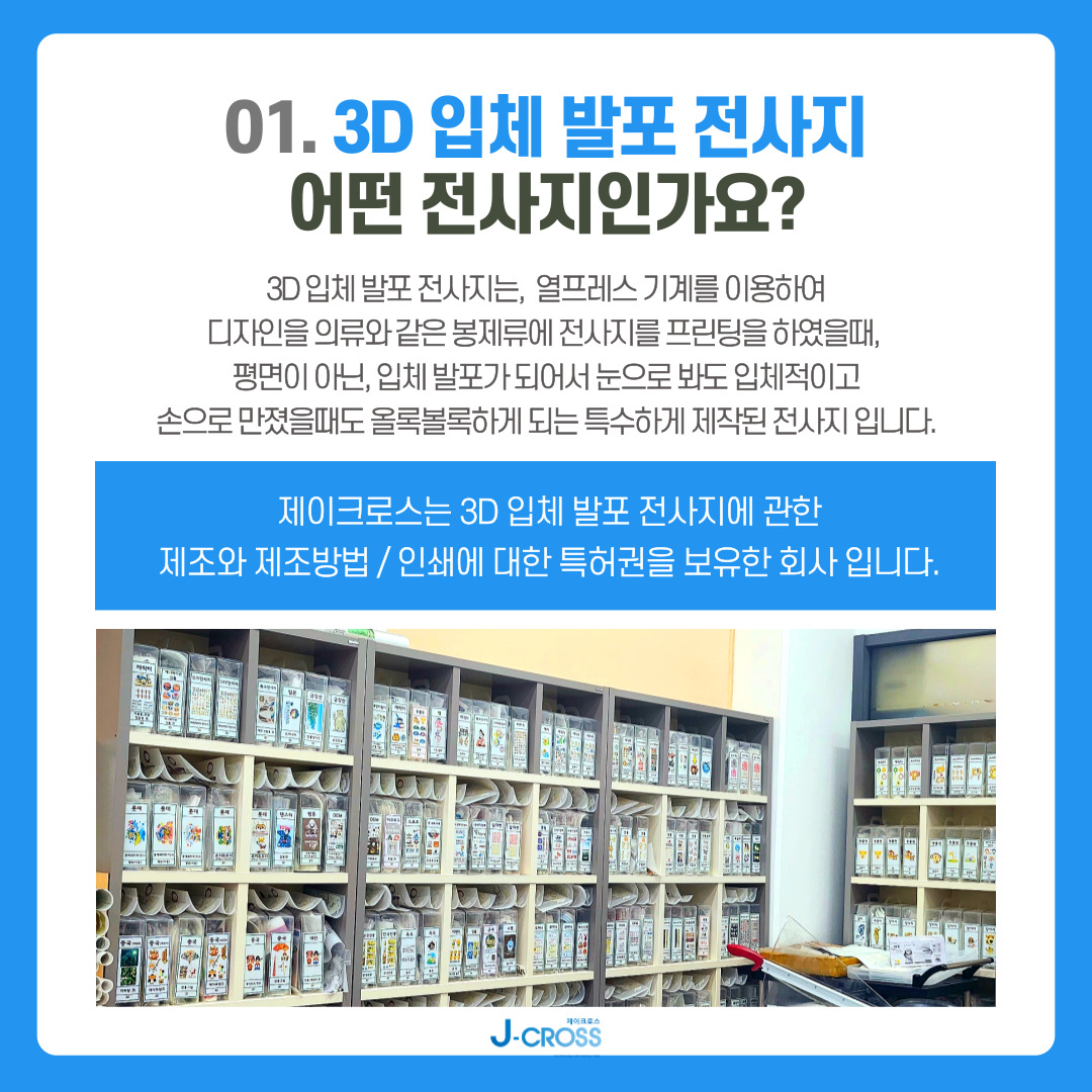 본 글에서는, 3D 입체 발포 전사지를 제작하는 제이크로스 회사에 대하여 알아보겠습니다